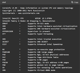 - Naviguer jusqu'au dossier où vous avez extrait Coreinfo (par exemple cd C:\Temp).