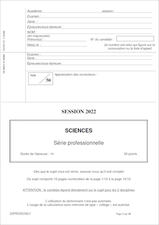 Sujet de DNB 2022 - Série Professionnelle