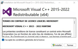 Un package redistribuable Microsoft Visual C++ doit alors être installé sur le système avant d’installer l'application.